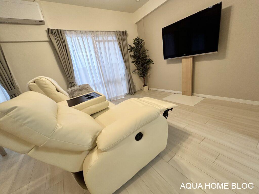 ミニマリストの中には、ソファーを手放す方もいますが、私はホテルのようなくつろげる部屋にしたかったので、「電動ソファー」を購入しました。