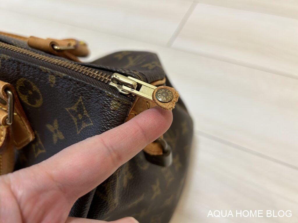 古いバッグなので、ファスナー部分の革が破損しています。